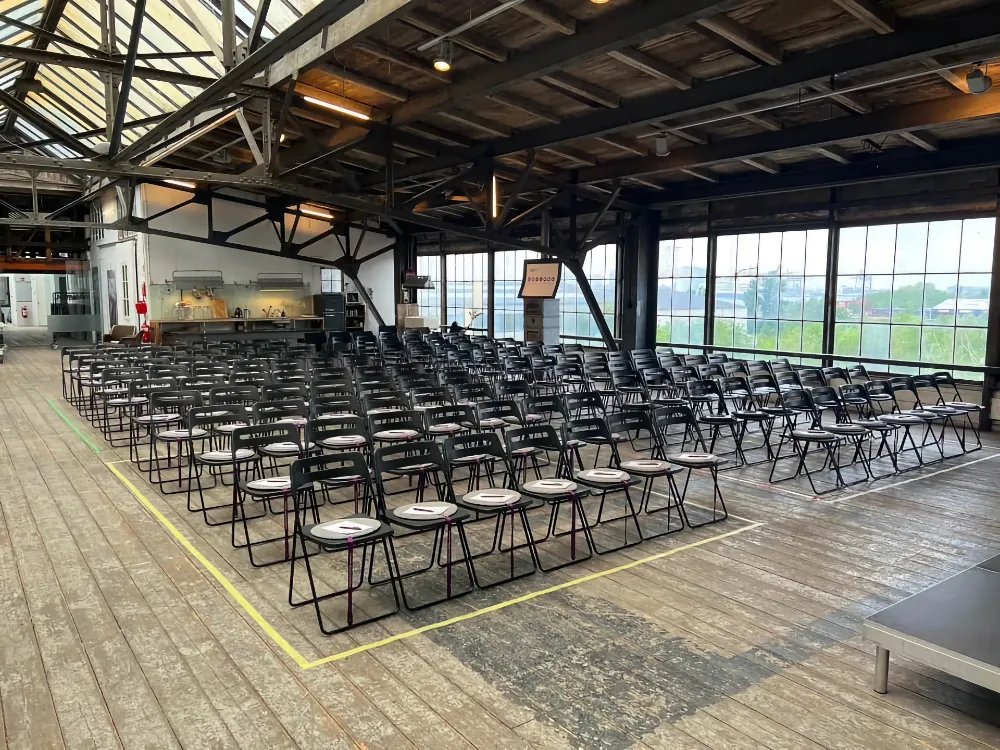 Skabelonloftet har en stor konferencesal med plads til op til 150 personer. Salen er udstyret med moderne teknologi og er designet til at imødekomme behovene hos et bredt spektrum af events. Når Skabelonloftet står som arrangør for større konferencer, så lejer vi ekstra haller ind for foden af loftet.